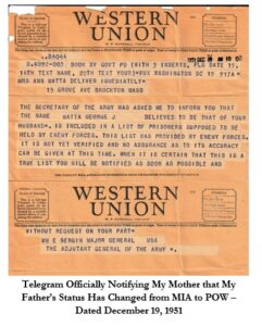 Telegram Officially Notifying Mrs. Matta that George Matta SFC’s Status Has Changed from MIA to POW – Dated December 19, 1951